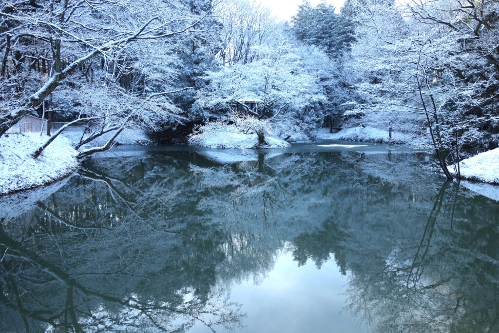 雪が積もった日には、辺り一面が白く染まり、思わず息をのむような美しさに出会えます。雪の上にたぬきの足跡が残っていることもあり、自然の営みを身近に感じられます。