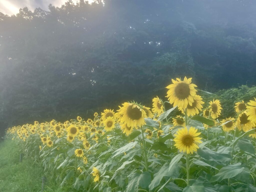 水車小屋の横の畑ではひまわりが咲き、青空や入道雲を背景に、森と稲が太陽に照らされる風景が広がります。